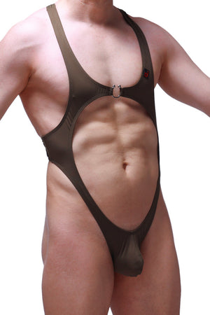 Dieser String-Body ist aus dunkelolivgrünem Nylon gefertigt, einem Stoff, der sowohl weich als auch dehnbar ist.