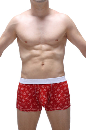 Rote Boxershorts mit Schneeflocken-Print. Nahtlose Fronttasche. Weiße Nähte passend zum Gürtel. Fällt etwas groß aus.