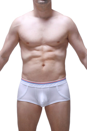 Bequeme weiße Modal-Boxershorts mit süßer Tasche und Seitennähten. Dreifarbiger PetitQ-Gürtel.