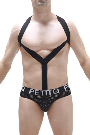 Schwarzer Tanga; aus Material, das einen guten Blick darunter zulässt, darüber ein elastischer Gurt für den Oberkörper.