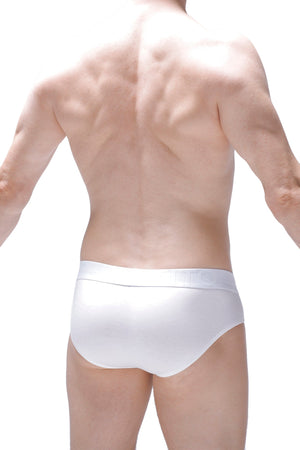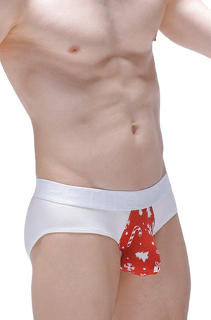 Bequemer weißer Slip mit genau dem richtigen Hauch von Weihnachten auf der roten Tasche mit Tannenbaum- und Zuckerstangen-Aufdruck. Passender weißer Gürtel.