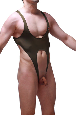 This thong bodysuit is made from a soft, dark olive green nylon , a fabric that is both stretchy and sexy.