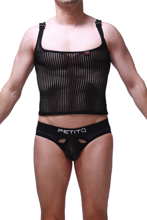 Black cropped tank top, almost like a crop top. Pleats at the top. Slightly sheer black fabric.