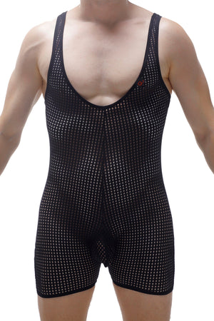 Black boxer bodysuit, like a wrestler's jumpsuit. It's well exposed on the torso. Slightly transparent in this wide-knit fabric. Composition :