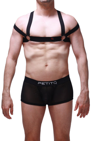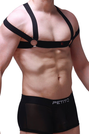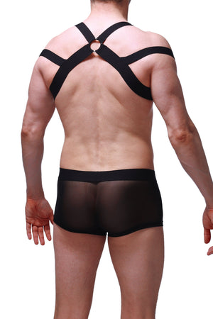 This harness is made of thin black straps that frame the upper body. Metal rings (clearly visible in the photo) connect the straps to the horizontal chest band, adding a modern and bold detail. Perfect for a sexy and assertive look, it can be worn alone or over a sheer top.