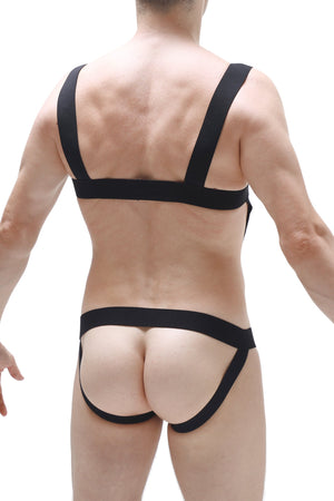 Black jockstrap at the bottom and elastic torso harness above. Sexy on top and bottom.