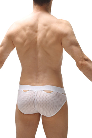 White low-rise briefs in breathable material with cutout around the matching white waistband.