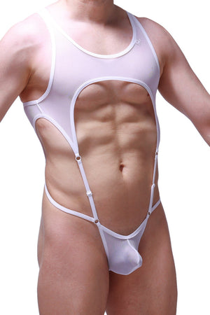 Ce body se compose d'un haut en filet transparent blanc qui couvre le torse. Ce tissu en maille aérée est à la fois léger et très sexy. La particularité du design réside dans l'ouverture centrale prononcée, laissant le ventre et la sangle pelvienne largement exposés.