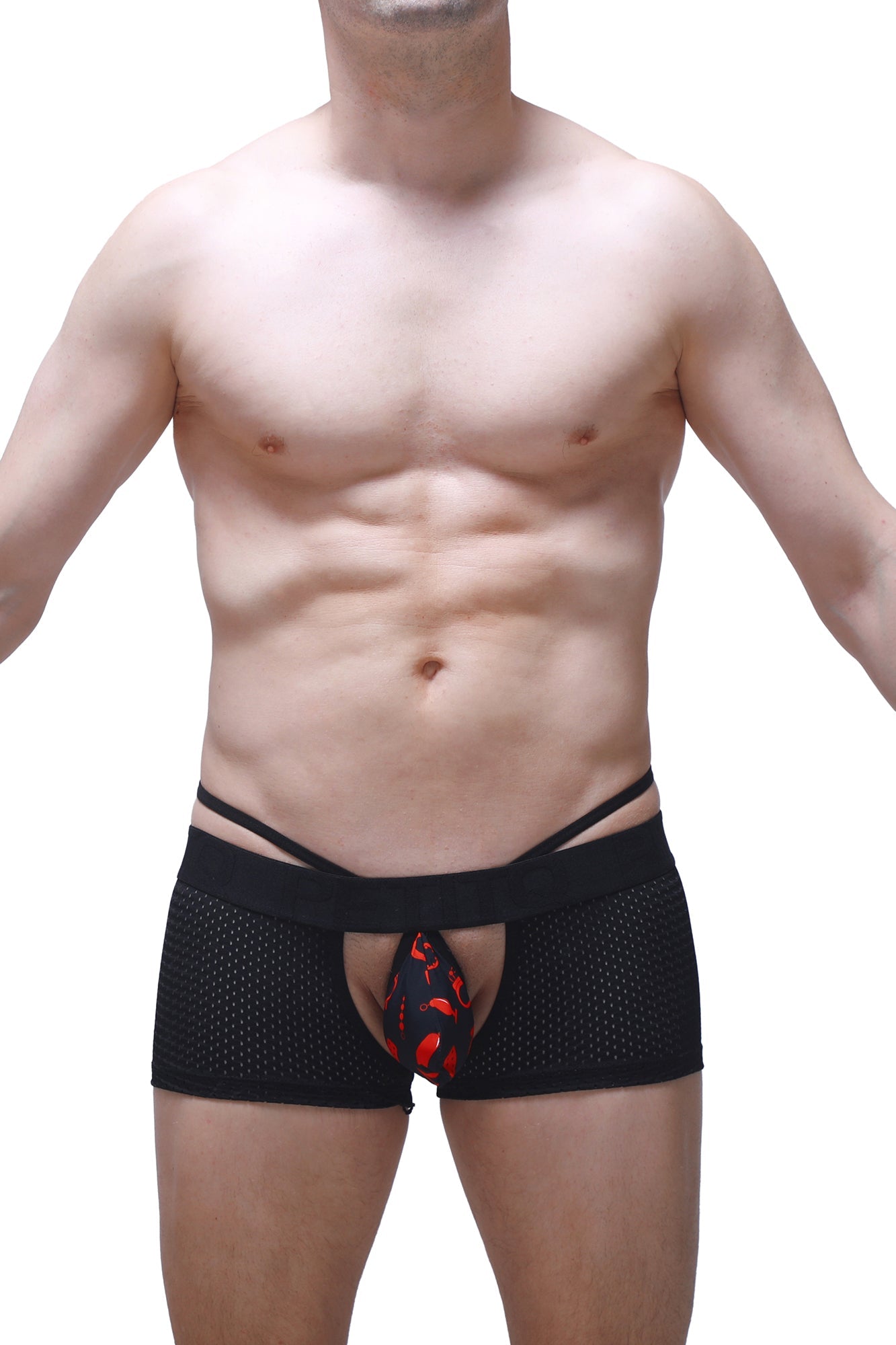Dessous versatile constitué de deux parties : un boxer noir ouvert à l'avant et à l'arrière, en dessous nous avons disposé un slingshot avec notre imprimé coquin de godes et menottes. A porter ensemble ou séparément.
